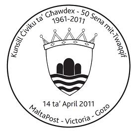 On the occasion of the 50th Anniversary from the founding of the Gozo Civic Council, MaltaPost p.l.c. informs that a special hand postmark - Kunsill Ċiviku ta' Għwdex - 50 sena mit-Twaqqif 1961-2011 will be used on Thursday 14th April 2011 at MaltaPost Victoria Gozo Branch.