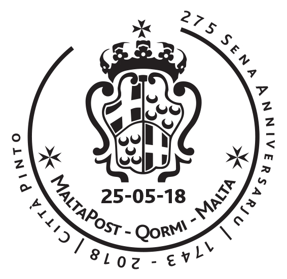 For the occasion of its 275th anniversary from when Hal-Qormi became recognized as a city and was given the prestigious title Citta Pinto by Grand Master Manuel Pinto da Fonseca, MaltaPost notifies the public that a special hand post mark will be issued on Friday 25th May 2018 at the Qormi, Post Office.