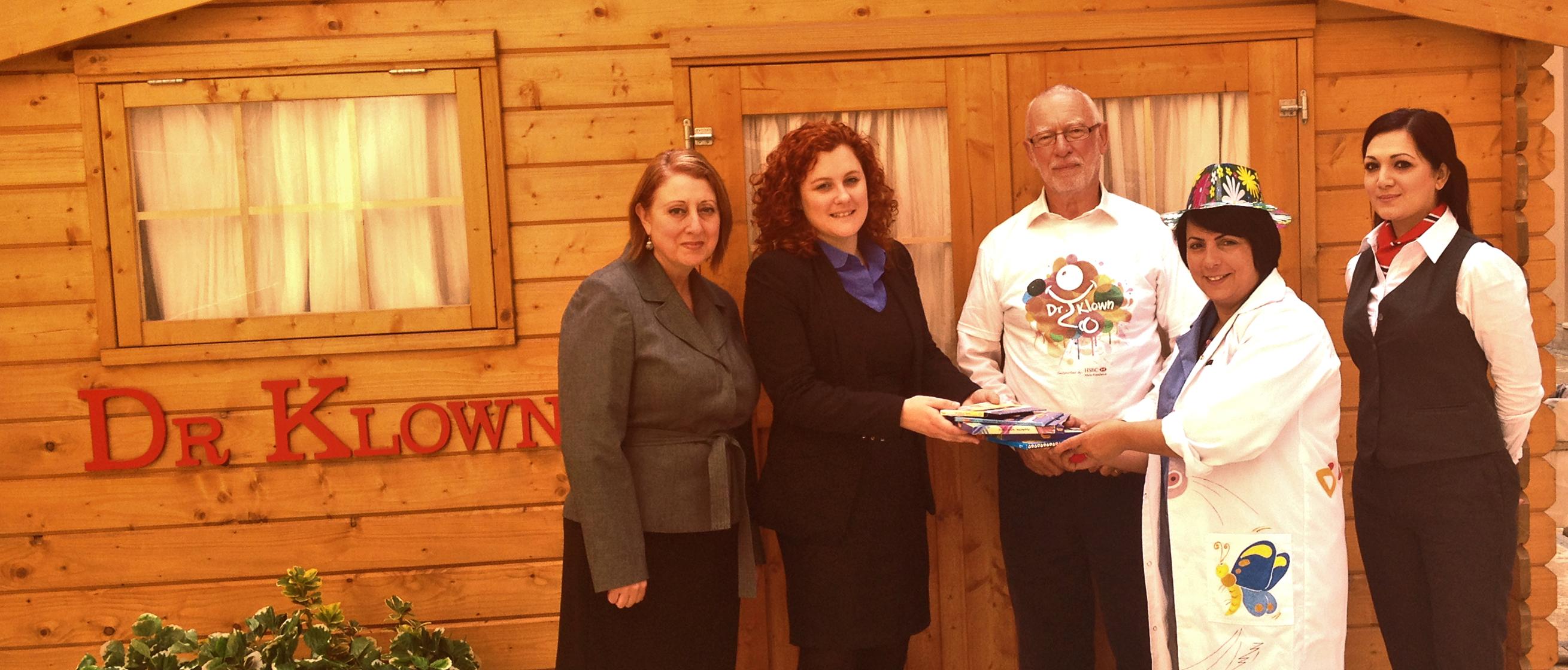 The gifts were presented by MaltaPost's Head Customer Experience Yolande Spiteri, Head Human Resources Stefania Camilleri and Marisa Caruana, a representative from the Human Resources Department who were welcomed by the Practice Development Nurse and Dr. Klown's Liason Office Claire Catanzaro as well as Maurice Sleypen, President of Dr. Klown in front of the Dr. Klown log cabin in Mater Dei.