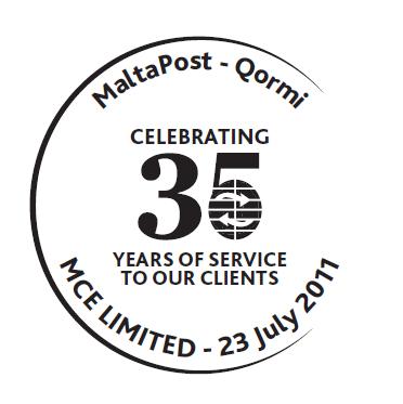 For the occasion of the 35th Anniversary from the establishment of MCE LIMITED, MaltaPost p.l.c. notifies that a special hand postmark - CELEBRATING 35 YEARS OF SERVICE TO OUR CLIENTS will be used on Saturday 23rd July 2011 at Qormi post office.